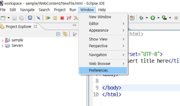 1) 이클립스 상단 메뉴의 Window->Preferences 메뉴를 클릭합니다.