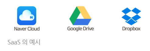 예) 세일즈포스닷컴의 CRM, 웹기반 개인용 스토리지 서비스(드롭박스, N드라이브 등), 구글 드라이브 (문서, 스프레드시트, 프레젠테이션)