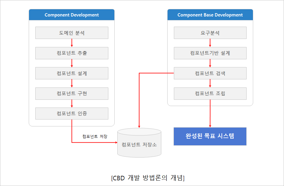 CBD 개발 방법론은 크게 컴포넌트를 개발하는 CD(Component Development) 단계와 개발된 컴포넌트를 사용해서 개발을 진행하는 CBD(Component Base Development) 단계로 나눌 수 있다. CD 단계에서는 도메인을 분석해 컴포넌트 대상 업무를 선별하고 컴포넌트를 개발해 저장소에 입력한다. CBD 단계에서는 요구 분석을 통해 컴포넌트 기반으로 설계하고 필요한 컴포넌트를 저장소에서 찾아서 조립하는 방식으로 프로그램 개발을 진행한다. 만일 필요한 컴포넌트가 저장소에 없다면 CD 단계로 돌아가서 컴포넌트를 개발하고 이를 사용해 개발을 계속 진행한다.