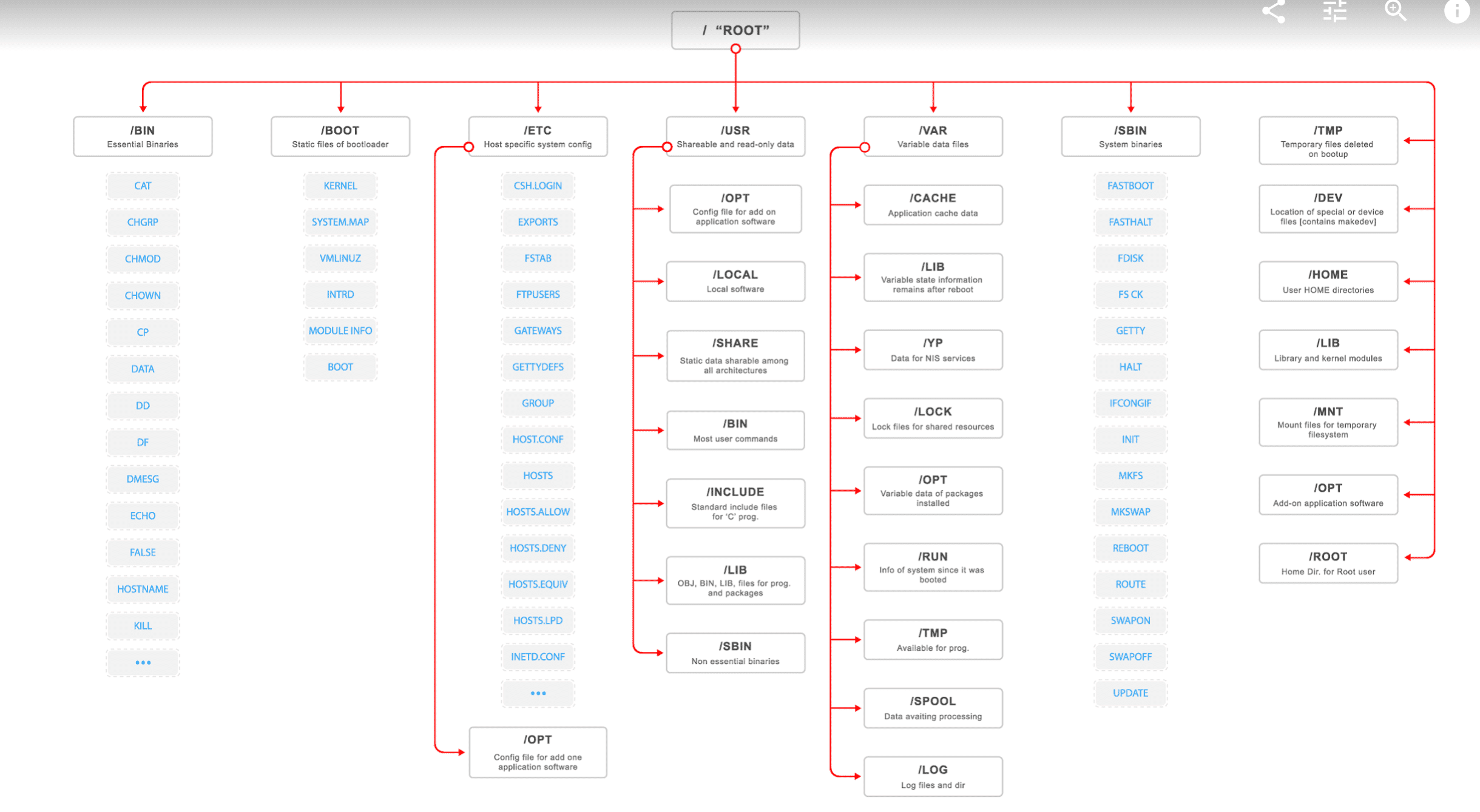 리눅스 시스템의 디렉토리 구조는 전체적으로 역 트리(tree) 구조를 하고 있습니다. 그리고 명령어의 종류와 성격, 사용권한 등에 따라 각각의 디렉토리들로 구분됩니다. 리눅스 배포판들은 '리눅스 파일시스템 표준'인 FSSTND(LINUX File System Standard) 라는 표준을 준수하므로 대부분의 리눅스 배포판들은 그 기본 골격이 같습니다.