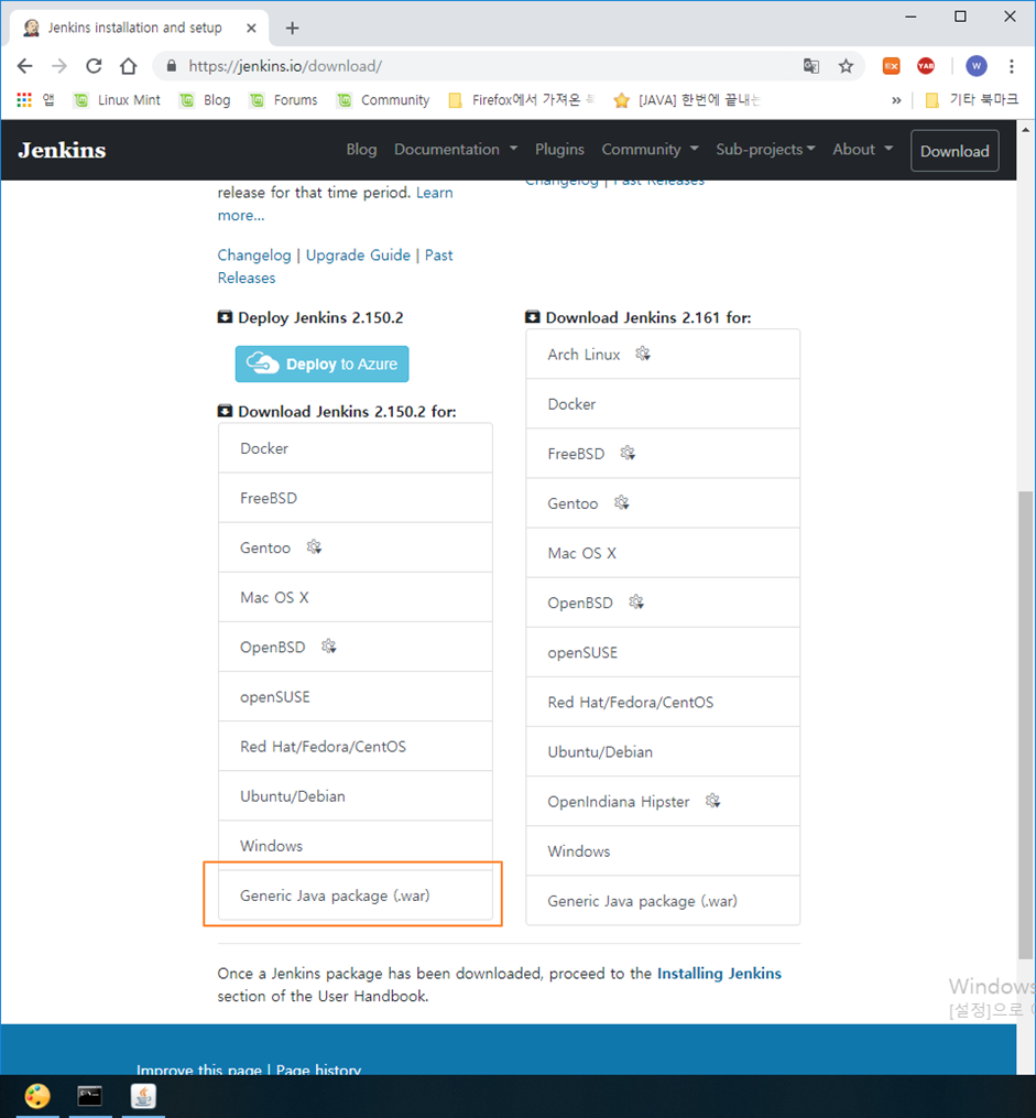 https://jenkins.io/download/ 에서 Long-term Support(LTS) 버전을 다운로드 한다.